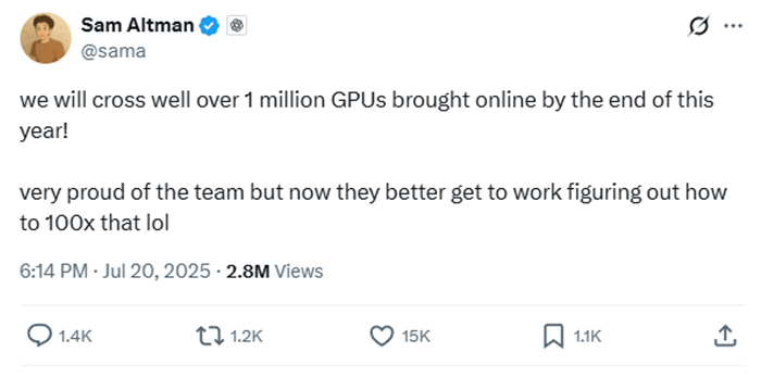 OpenAI CEO Sam Altman publicly stated that the Company will have over 1 million GPUs online by year-end.